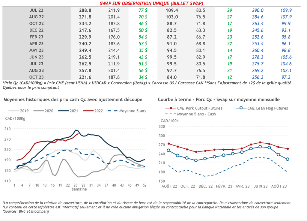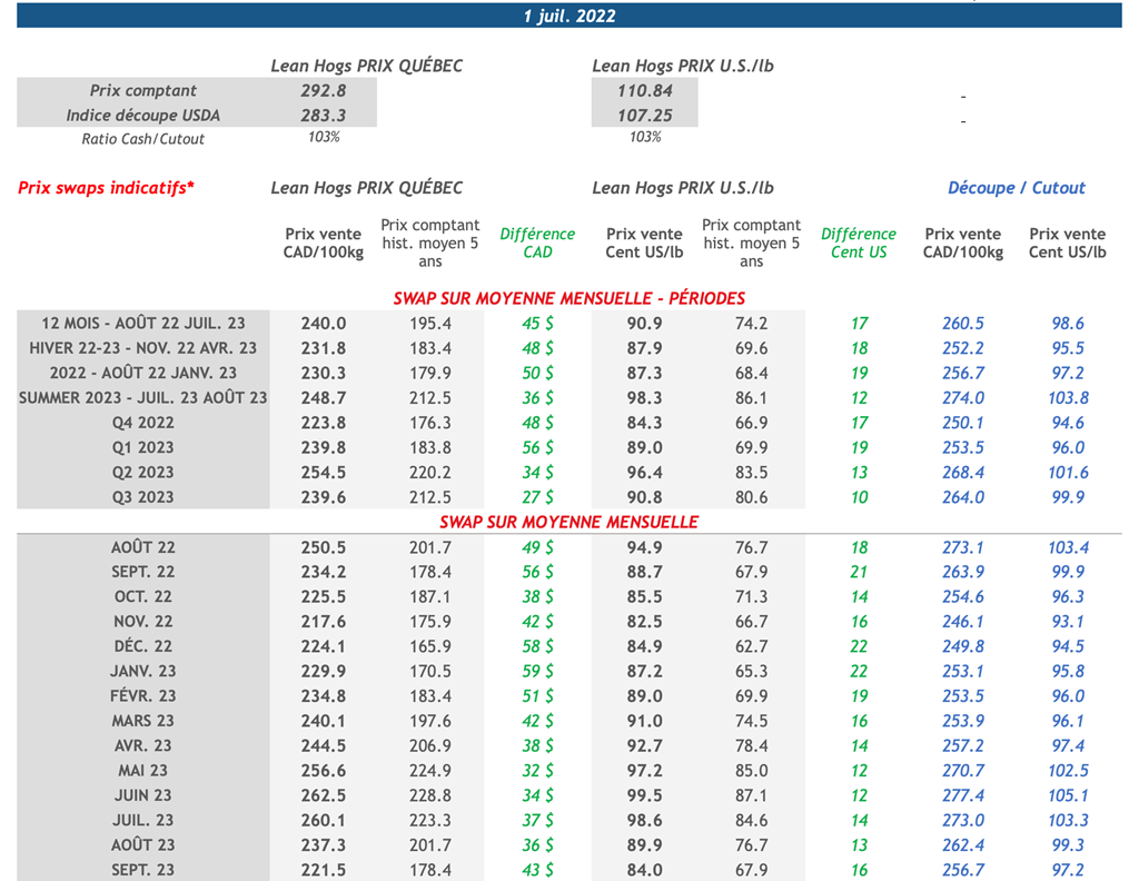 • Hier, le prix du porc d'août-22 a commencé la journée en hausse, mais a par la suite rebaissé pour clôturer à 102,10 cents US/lb, en baisse1,48 cent US/lb par rapport à la fermeture de mercredi.