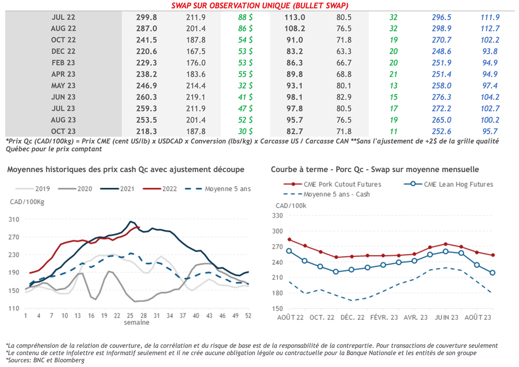 • Les prix à terme du porc ont terminé de manière mixte hier, mais ont relativement bien comporté dans un contexte de vente généralisée des commodités. Le contrat de juillet-22 a gagné 2,550 cents US/lb sur la journée pour atteindre 112,150 cents US/lb. Le contrat d'août-22 a gagné 2,975 cents US/lb sur la journée pour atteindre 105,950 cents US/lb - la valeur de clôture la plus élevée du contrat depuis le 24 juin.