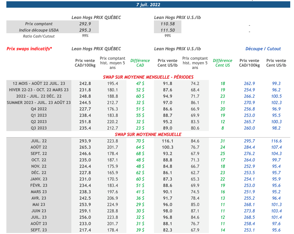 • La valeur de la découpe du porc américain s'est établie à 111,50 cents US/lb, en baisse de 2,98 cents US/lb sur la journée. Le flanc a perdu tout son gain de la veille et un peu plus.