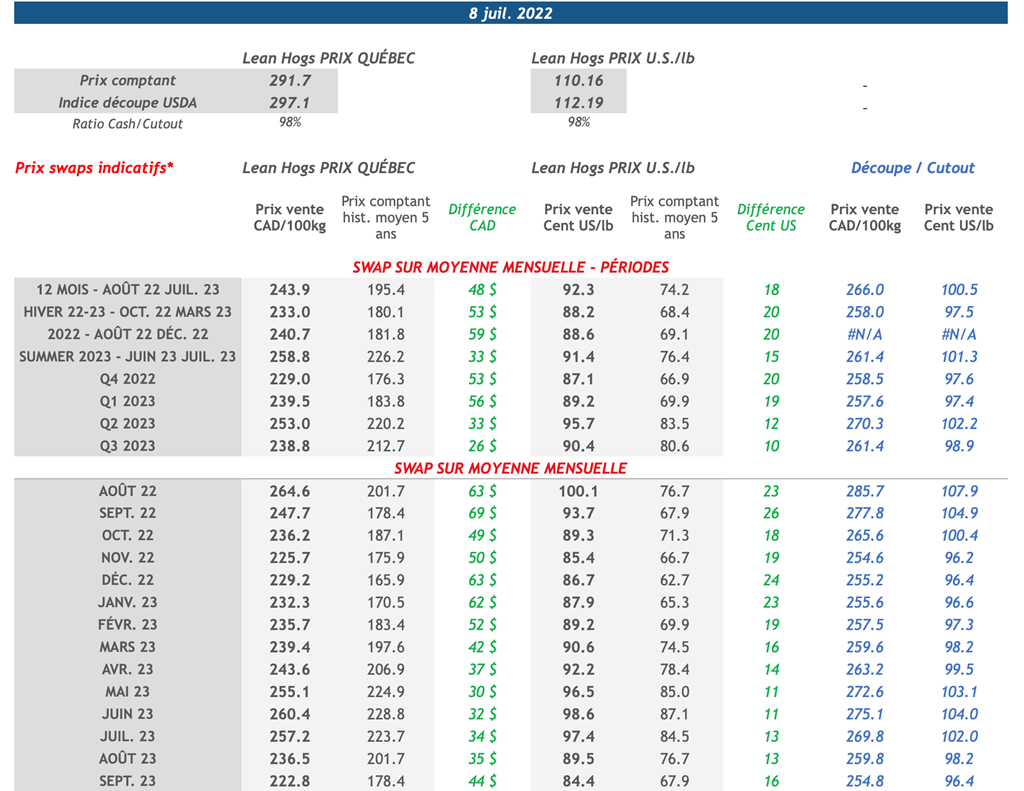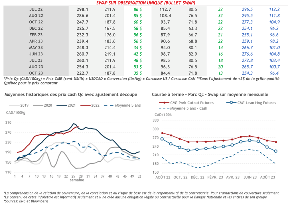 • Hier, les contrats du mois d'août-22 ont augmenté de 0,30 cents US/lb à 109,50 cents US/lb, leur plus haut niveau depuis le 21 juin, soutenu par l'apaisement des inquiétudes concernant la demande de porc.