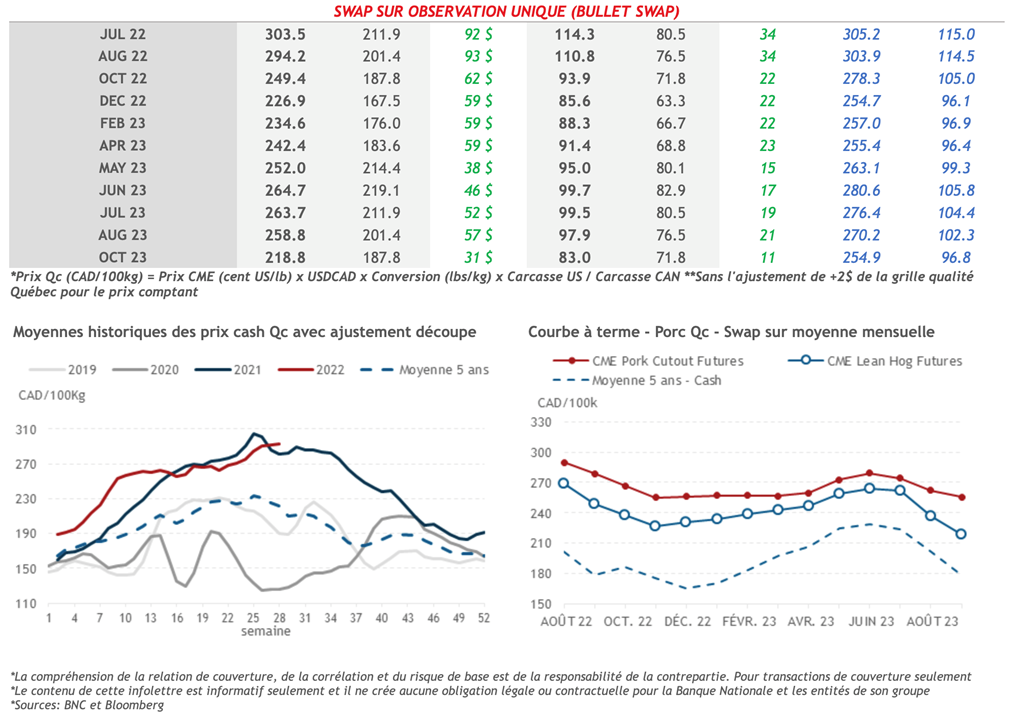 • La hausse de la valeur de la découpe du porc aux États-Unis a également apporté un soutien aux contrats à terme. L'indice s'est établi hier à 117,47 cents US/lb, en hausse de 2,40 cents US/lb sur la journée. Ce matin, l'indice du porc au comptant du CME s’est établit à 112,57 cents US/lb.