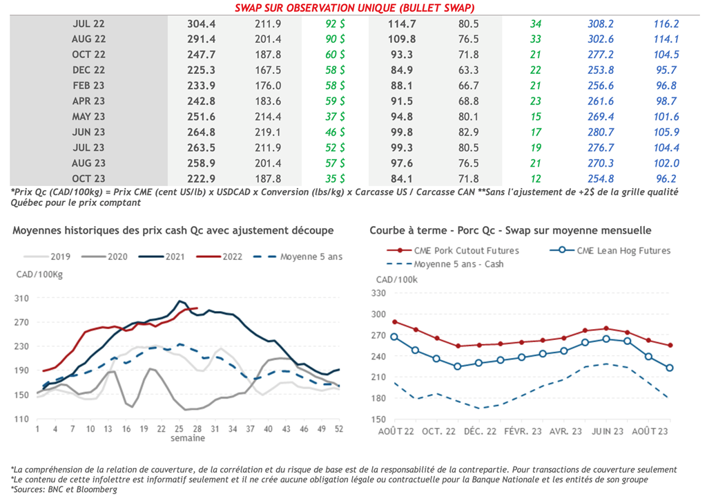 • Hier, seul le contrat juillet-22 a affiché un gain, la progression continue des valeurs de découpe du porc ayant fourni un support. Les contrats juillet-22 ont terminé la journée en hausse de 0,425 cent US/lb à 114,925 cents US/lb. Les contrats août-22 ont baissé de 0,925 cent US/lb à 109,575 cents US/lb. L'escompte des contrats à terme d'août par rapport à juillet est maintenant assez important, à 5,35 cents US/lb.