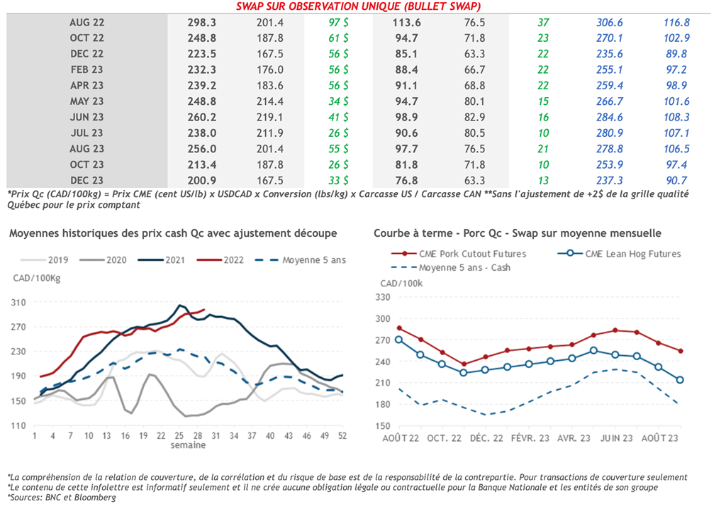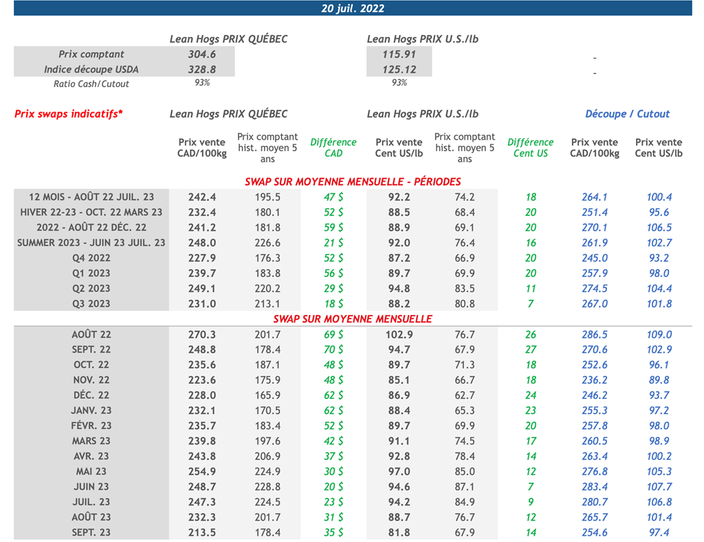 • Hier, le calendrier des contrats à terme a terminé la journée de manière mixte, les contrats les plus éloignés de l'échéance enregistrant les gains les plus importants. Le contrat d'août-22 a augmenté de 0,700 cents US/lb pour atteindre 112,825 cents US/lb ― le prix de clôture le plus élevé du contrat depuis la fin avril. Les contrats ont entre autres été soutenus par des signes indiquant que la demande pour la viande reste forte bien malgré les craintes de récession.