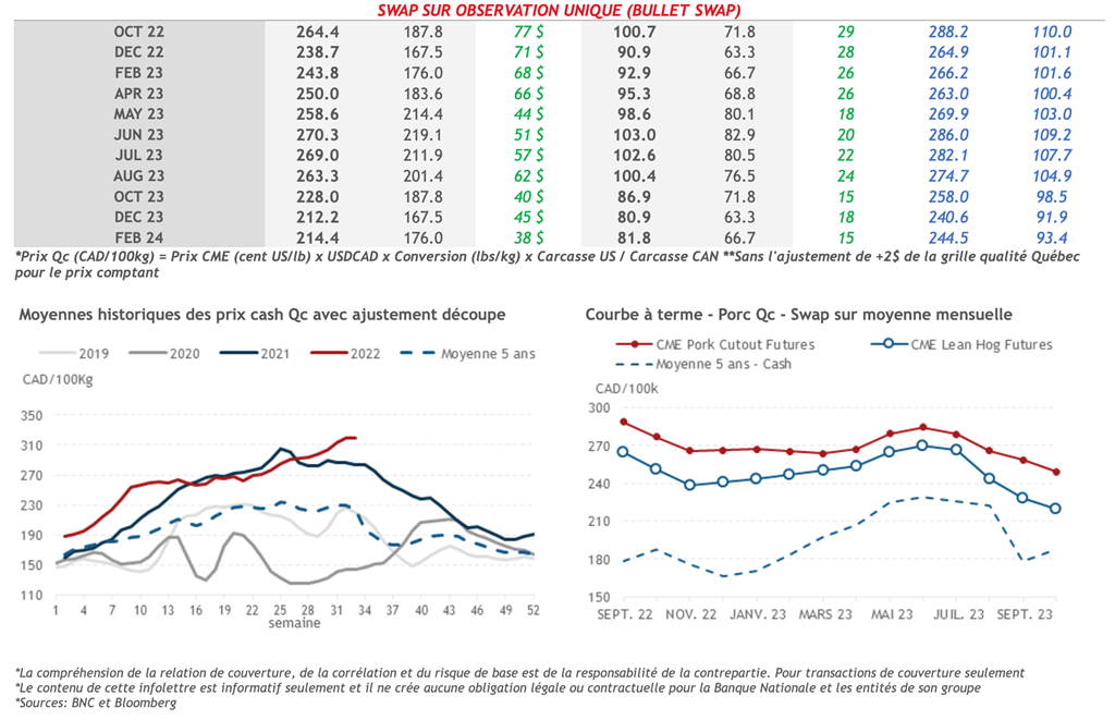 • Malgré les signaux de faiblesse économique émanant de la Chine et la force du dollar américain, la solidité des fondamentaux du marché au comptant a aidé à soutenir les contrats à terme sur le porc hier, les plus grands gagnants étant les contrats d'oct.-22 et déc.-22 qui ont augmenté de 0,55 cent US/lb et 0,475 cent US/lb respectivement. En fait, le contrat déc.-22 a terminé à un niveau record, soit 90,85 US cent/lb, tandis que le contrat oct.-22 n'était qu'à 0,50 US cent/lb de son niveau record de 101.08 atteint la semaine dernière.