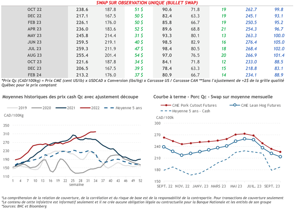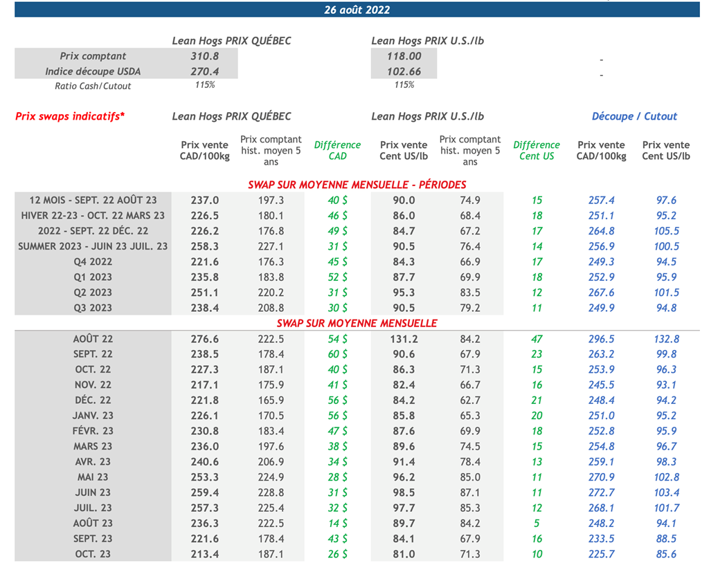 • Parlant du marché au comptant, l'indice du porc au comptant CME a reculé de 1,18 cents US/lb à 118,00 cents US/lb. Quant à la découpe du porc américain, la longe a tiré l'indice vers le bas de 0,33 cent US/lb à 102,66 cents US/lb, malgré l'appréciation du jambon.