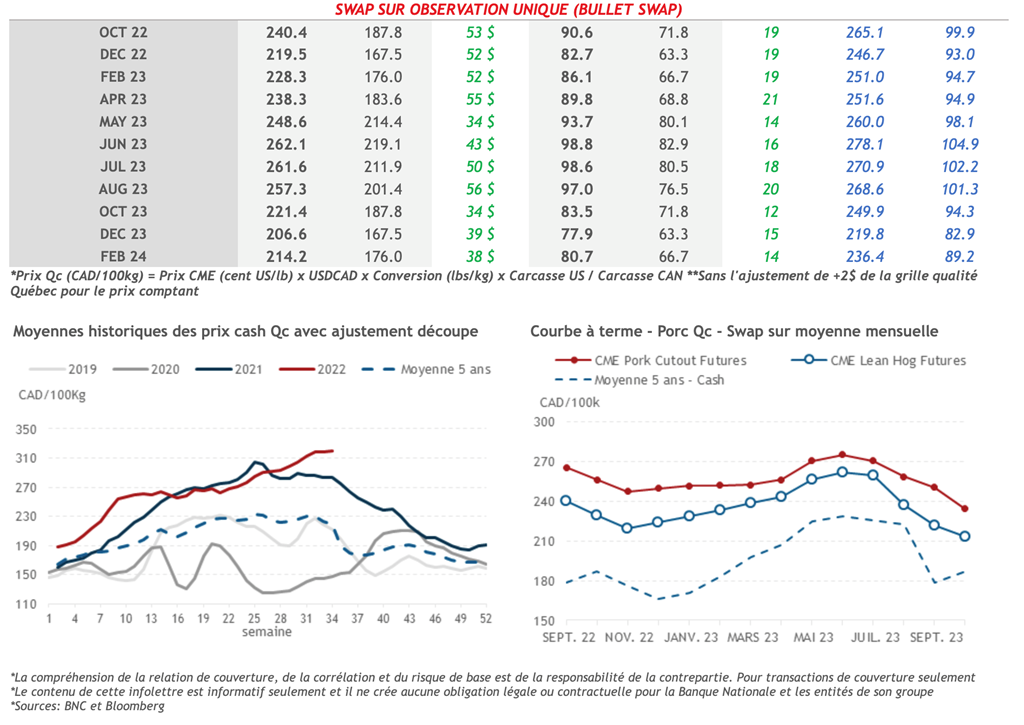 • La découpe du porc américain a terminé la semaine en baisse de près de 15 cents US/lb à 102,23 cents US/lb ― la plus faible valeur de la découpe depuis début juin. L'indice du porc au comptant CME a perdu 4,55 cents US/lb sur la semaine pour atteindre 116,05 cents US/lb ― son plus bas niveau depuis près de six semaines.