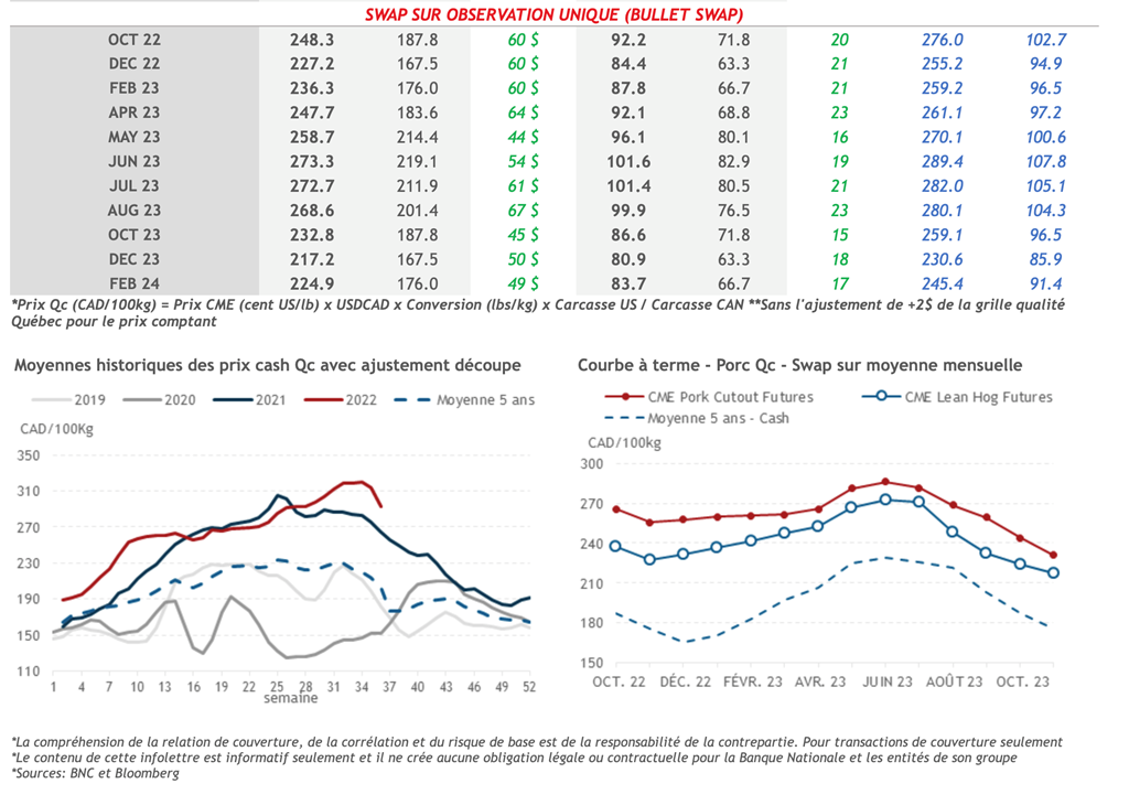 • Le marché au comptant reste morose entre autres avec une baisse des abattages la semaine dernière. Hier, l'indice du porc au comptant CME a perdu 1,52 cents US/lb à 104,74 cents US/lb. Du côté du commerce de gros, la découpe américaine a gagné 2,08 cents US/lb à 104,33 cents US/lb, grâce à la hausse de la valeur du flanc.