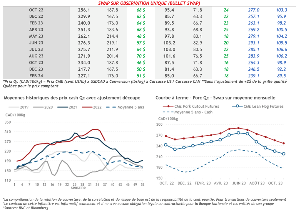• Hier, les prix à terme du porc ont clôturé en forte hausse sur la séance. Les facteurs haussiers comprenaient des attentes d'une nouvelle augmentation des valeurs de la découpe et la spéculation selon laquelle la récente détérioration du marché au comptant entraînerait une amélioration des marges des conditionneurs. Le prix du contrat d'octobre-22 a augmenté de 3,88 cents US/lb pour atteindre 95,75 cents US/lb, son plus haut niveau depuis le 17 août. Le prix du contrat de décembre-22 a augmenté de 2,93 cents US/lb pour atteindre 85,70 cents US/lb.