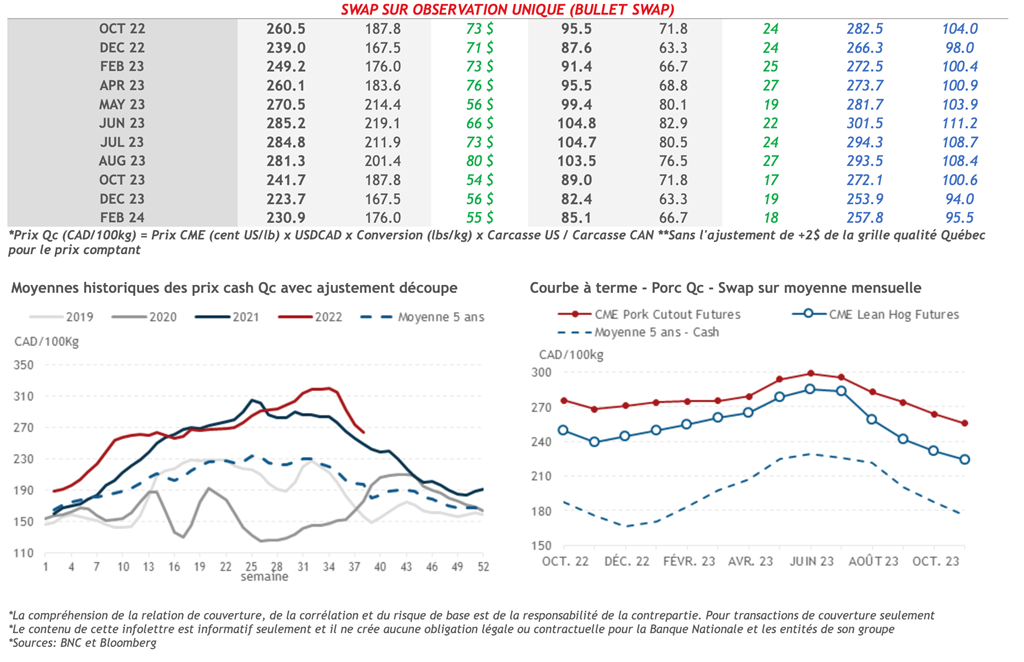 • L'indice CME Lean Hogs Cash a enregistré un troisième gain consécutif après une série de 22 pertes consécutives. L'indice s'est établi hier à 98,42 cents US/lb, soit une hausse de 0,45 cents US/lb. Quant à la découpe américaine, le jambon et le flanc ont pesé sur l'indice, entraînant une perte de 0,70 US cents/lb à 105,18 US cents/lb.