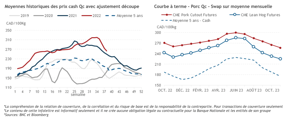 • Le pétrole brut WTI est en voie de connaître une quatrième baisse hebdomadaire consécutive, les craintes entourant les perspectives de la demande s'étant renforcées après une vague de hausses des taux d'intérêt dans le monde. Le WTI a clôturé à 83,49 USD/baril hier, en baisse de 1,9% par rapport à la clôture de jeudi dernier. Ce matin, le pétrole est en forte baisse, se transigeant sous la barre des 80 USD/baril pour la première fois depuis janvier dernier.