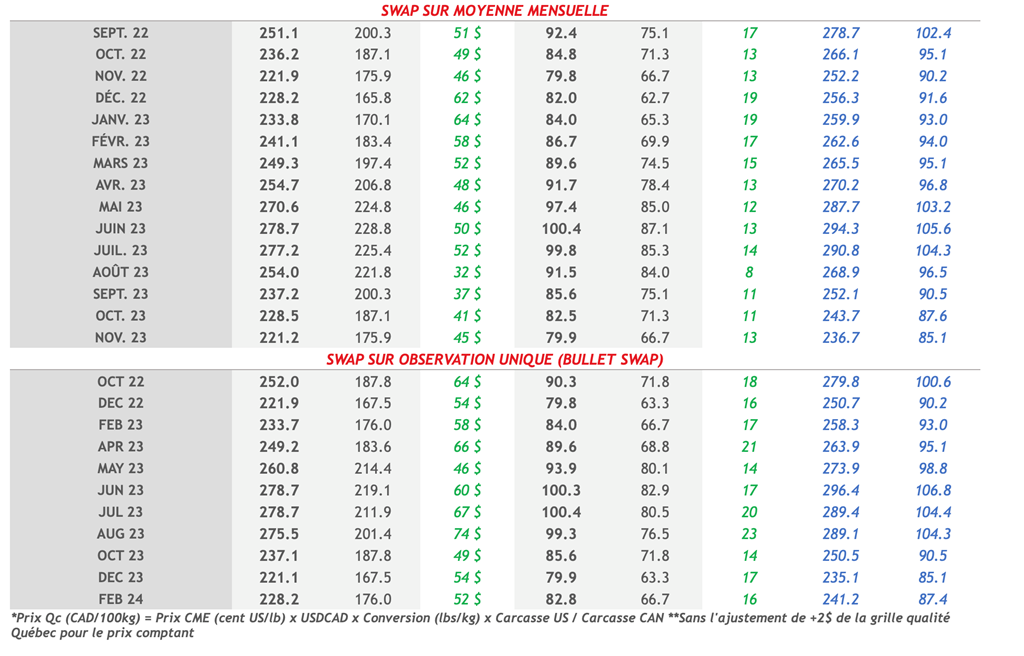 • La plupart des marchés étaient dans le rouge foncé hier, et le marché du porc n'a pas été épargné. Le contrat actif de décembre-22 a été le plus en baisse, perdant 3,40 cents US/lb pour terminer la journée à 79,40 cents US/lb, son plus bas niveau depuis janvier.
