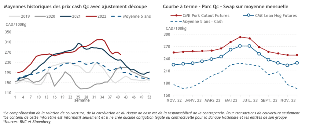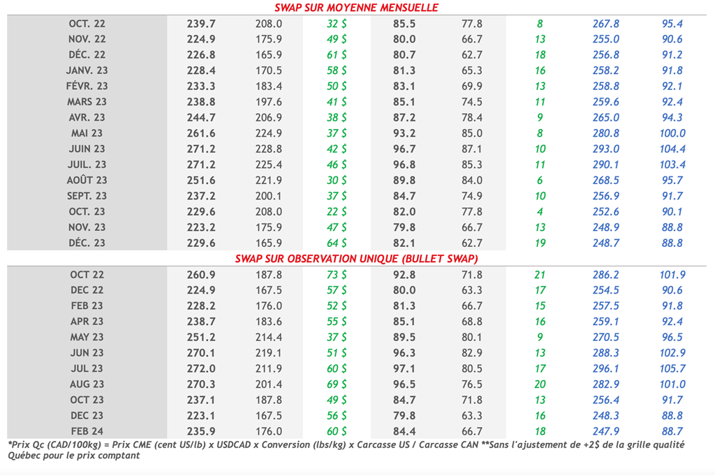 • L'indice du porc au comptant CME a augmenté de 0,33 cent US/lb pour atteindre 92,98 cents US/lb. Les porcs de décembre se négocient toujours avec un escompte de 14 cents US/lb par rapport à l'indice au comptant, comparativement à un escompte normal de 3 à 4 cents US/lb pour cette période de l'année.