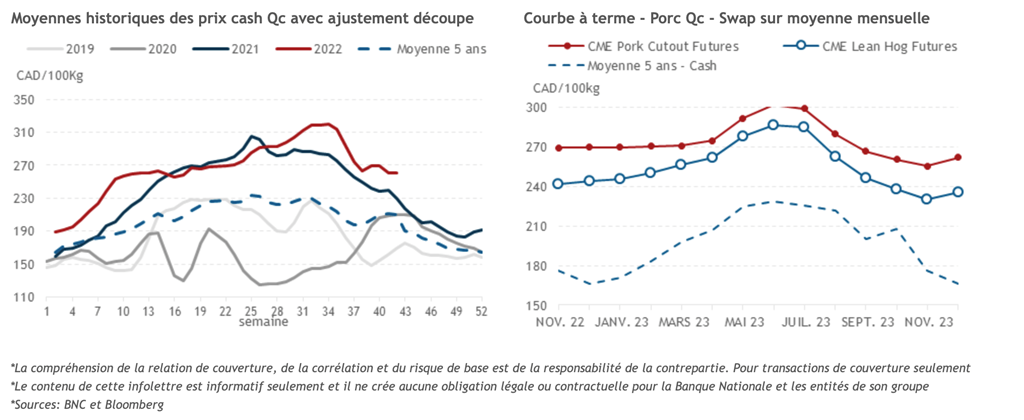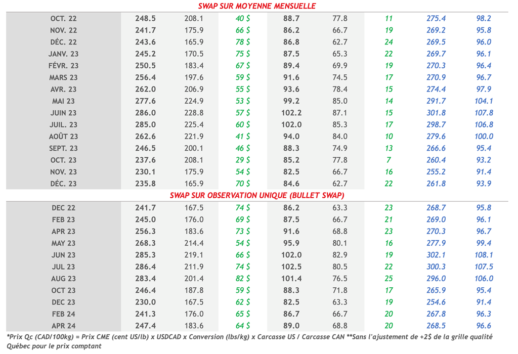 • Hier, les prix à terme du porc ont prolongé leur forte hausse pour une troisième journée consécutive, atteignant un sommet de quatre semaines, dans un contexte d'optimisme quant à la demande et de renforcement des fondamentaux au comptant. Le porc de décembre-22 a augmenté de 1,53 cents US/lb pour atteindre 86,48 cents US/lb, ce qui constitue le plus haut niveau de clôture du contrat depuis le 20 septembre. Le contrat février-23 a augmenté de 1,825 cents US/lb pour atteindre 87,80 cents US/lb, tandis que les contrats d’avril et mai-23 ont tous deux enregistré des gains supérieurs à 2 cents US/lb.