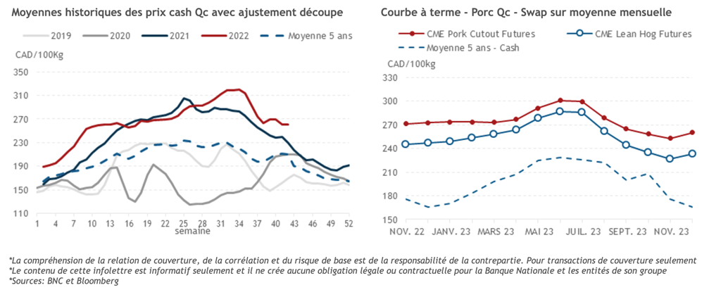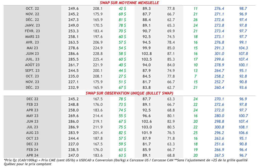 • À l'exception du contrat de décembre-22, le marché du porc a réalisé des gains impressionnants la semaine dernière, terminant à la hausse lors de six des sept dernières séances de négociation. Décembre-22 a terminé la semaine à 89,13 US cents/lb, en baisse de 4,55%. Les contrats à terme de février à juin-23 ont tous terminé avec des gains hebdomadaires de 10% ou plus. Nous nous rapprochons des sommets atteints en début septembre pour la plupart des contrats.