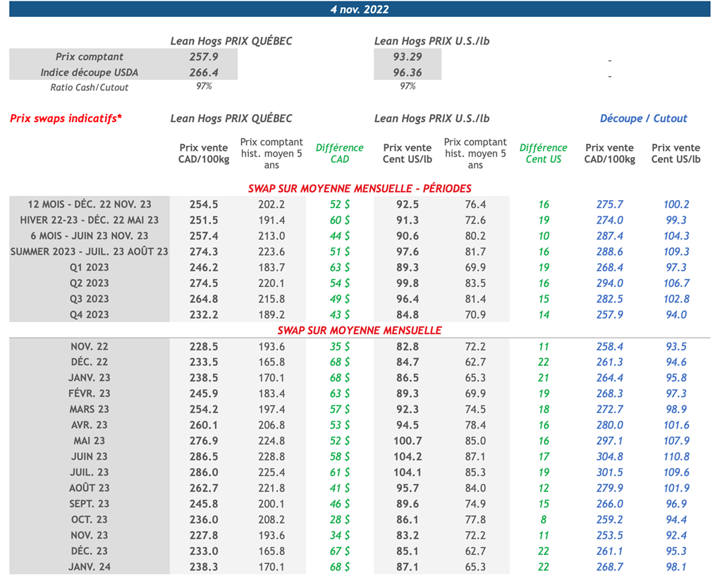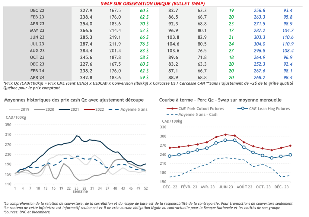 • Dans l'ensemble, la journée d'hier a été plutôt calme sur le marché du porc, les deux contrats les plus actifs, soit décembre-22 et février-22, ont terminé à moins de 0,1 cent US/lb de leur clôture de la journée précédente sur des volumes relativement faibles.