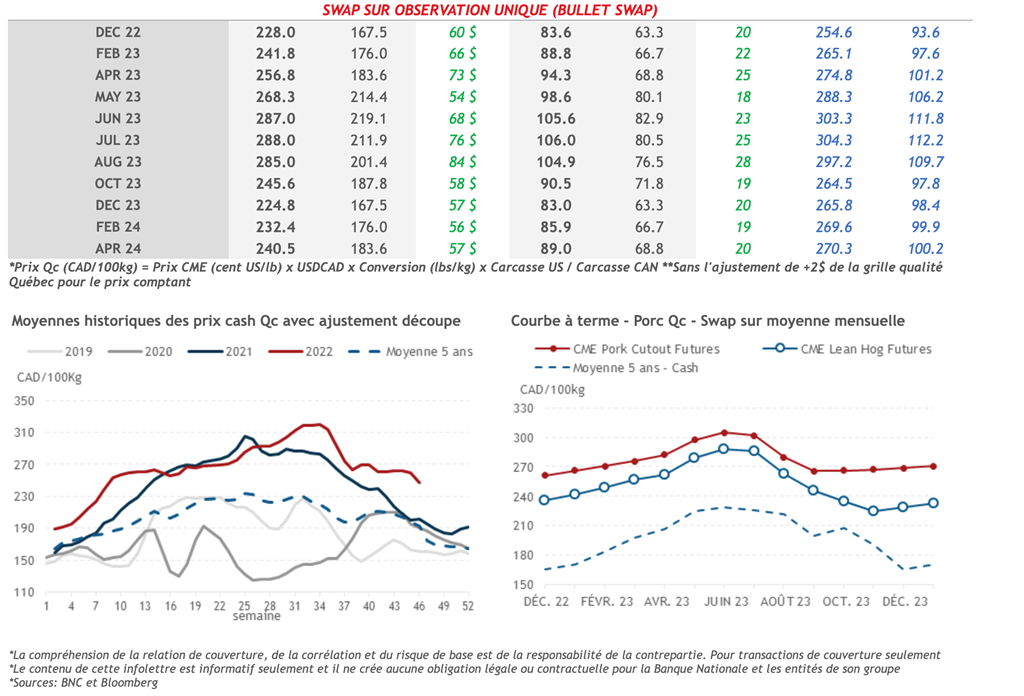 • La tendance à la baisse sur le marché au comptant se poursuit, l'indice du porc au comptant CME ayant enregistré une perte de 0,31 cent US/lb hier, pour atteindre un nouveau bas de 9 mois à 88,22 cents US/lb. Le tableau n'est pas trop différent pour la découpe. Une baisse de plus de 6 cents US/lb dans le flanc a contribué à envoyer l'indice à 92,63 cents US/lb, près d'un bas de 10 mois.