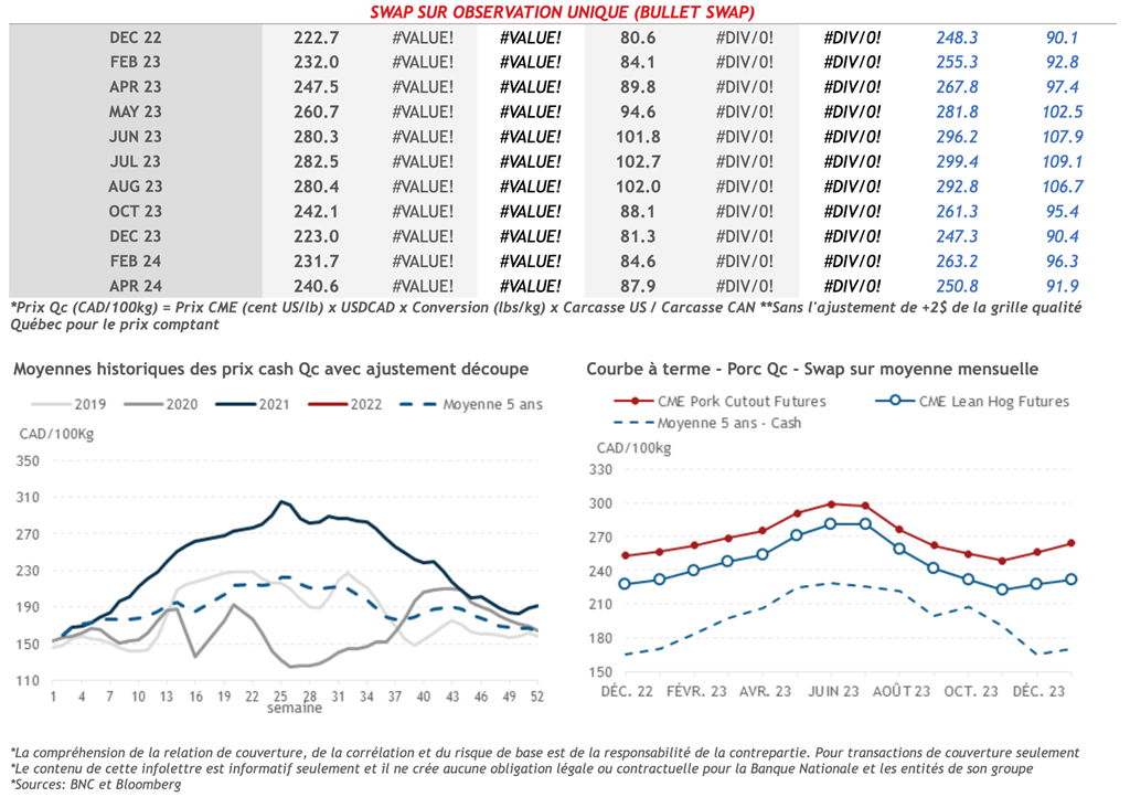 • Tous les contrats sur le porc étaient en forte baisse hier, avec en tête le contrat actif de février-23 qui a perdu 3,75 cents US/lb sur la journée pour clôturer à 84,75 cents US/lb. La faiblesse du marché au comptant ainsi que les protestations en Chine concernant les restrictions liées à la Covid ont probablement contribué au mouvement baissier.
