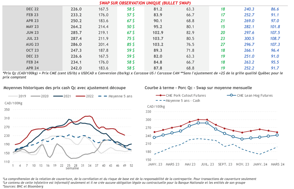 • Hier, les prix à terme du porc ont fortement chuté en raison d'un mauvais rapport des ventes à l'exportation, ce qui a suscité des inquiétudes quant à la demande future. Le contrat de février-23 a perdu 1,95 cents US/lb à 84,70 cents US/lb, tandis que le contrat d’avril-23 a perdu 2,08 cents US/lb à 90,75 cents US/lb.