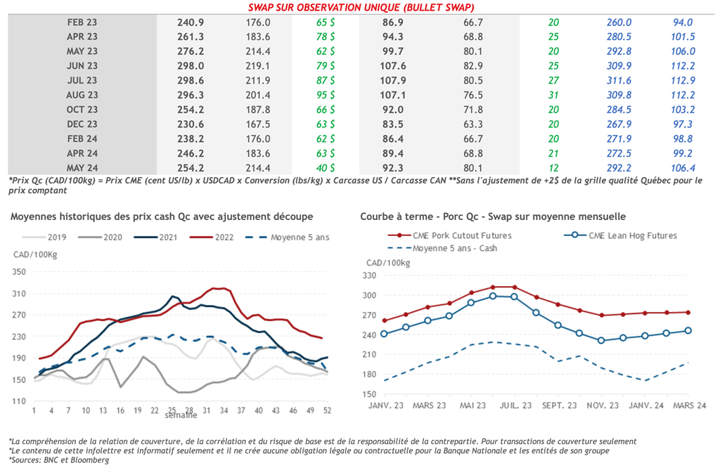 • Tous les contrats de porc ont terminé en hausse hier, le contrat actif de février-23 clôturant à son plus haut niveau depuis le 5 décembre. Les perturbations météorologiques dans le Midwest, qui risquent de perturber la commercialisation, ont apporté un soutien, de même que l’excellent rapport sur les ventes à l'exportation.