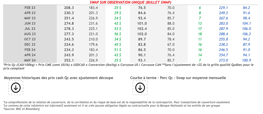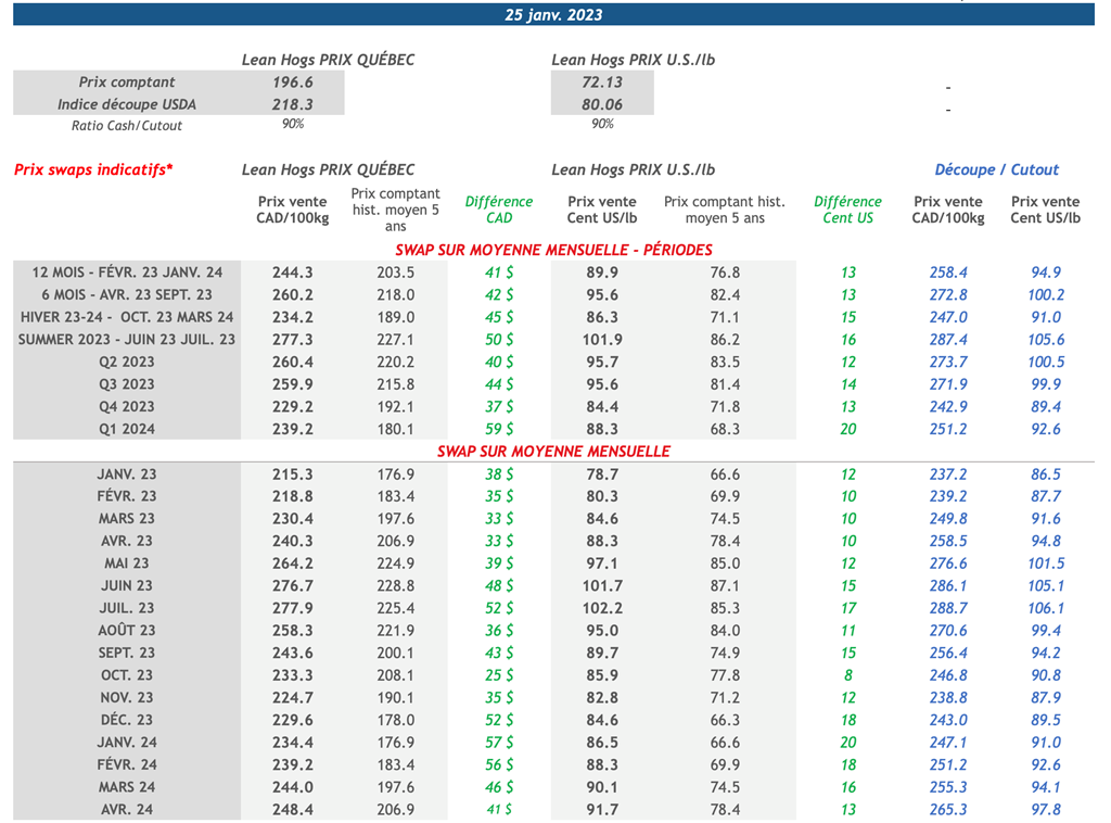 • Encore des pertes pour les contrats à terme hier. Les porcs de février-23 ont chuté de 0,48 cent US/lb à 77,10 cents US/lb, tandis que les contrats d'été ont affiché des pertes plus proches de 1 cent US/lb. L'abattage massif de porcs remet en question la réduction de la taille du cheptel décrite dans le rapport Hogs & Pigs de décembre.