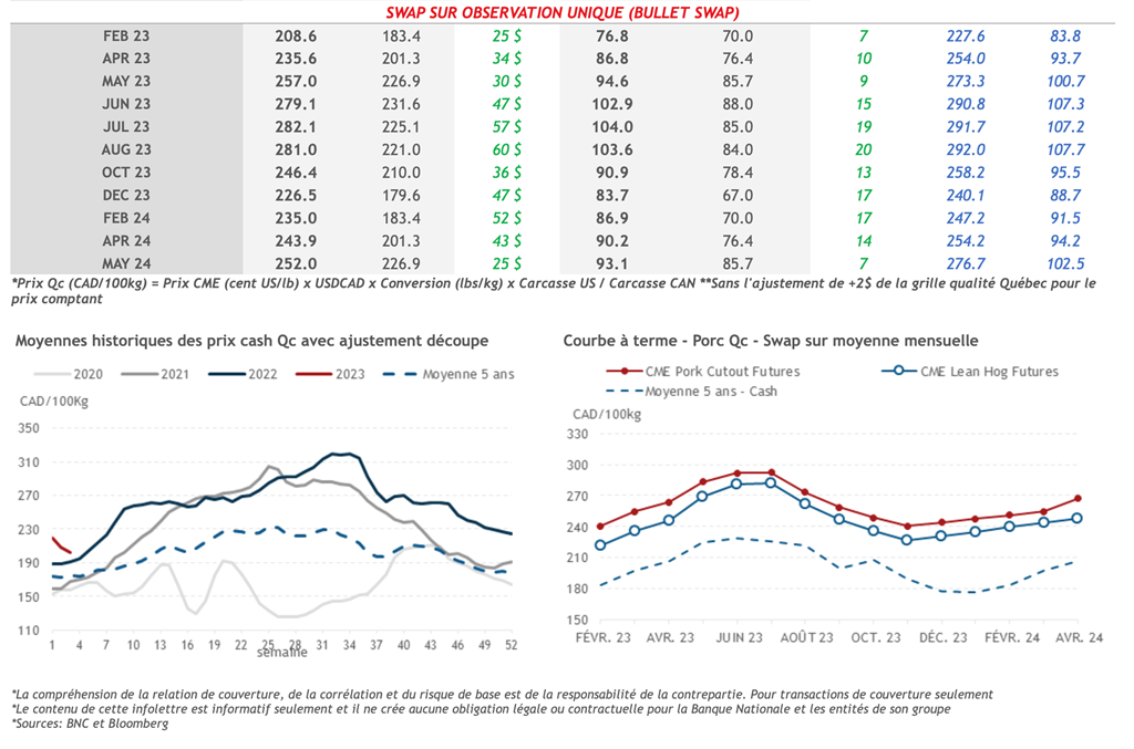• Hier, les contrats à terme sur le porc ont commencé à se négocier assez timidement, en réaction au rapport mensuel sur les inventaires de congelé publiés mercredi après-midi. Mais le contrat actif, Avril-23, s'est rapidement redressé et a fortement augmenté par rapport au bas de la journée pour clôturer à 87,00 US cents/lb, en hausse de 1,68 US cents/lb. Il ne faudra pas beaucoup de nouvelles positives pour susciter des achats, car le marché est profondément survendu sur le plan technique.