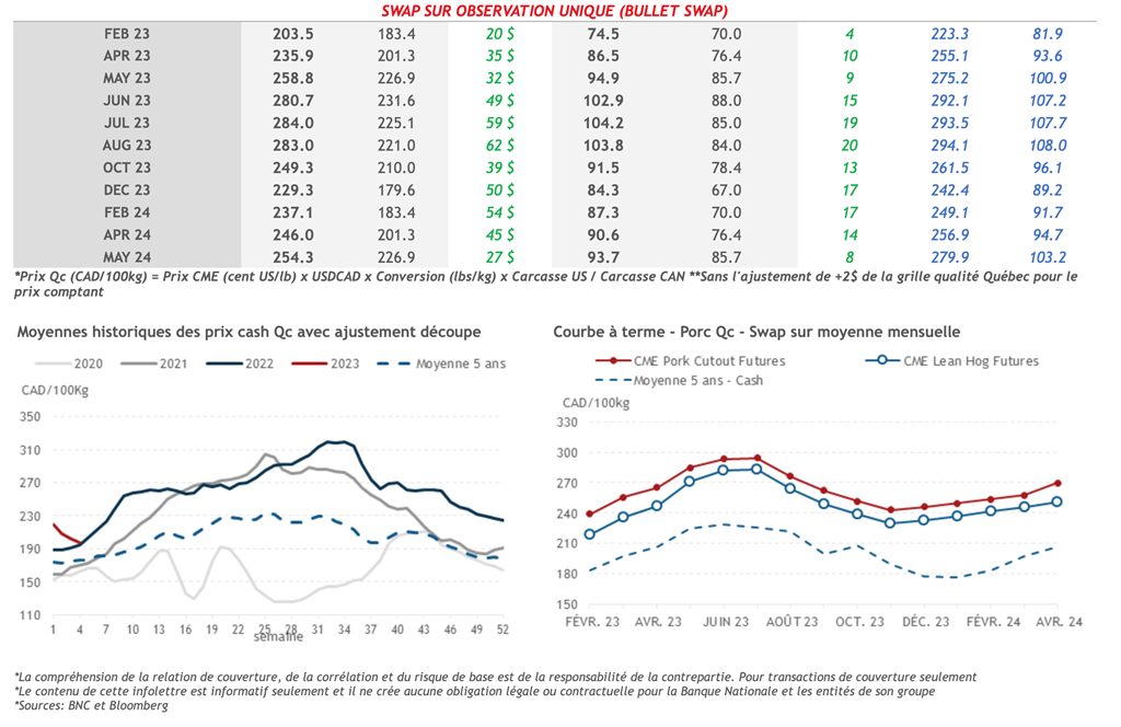 • L'indice du porc au comptant CME a continué de montrer des signes de rebond avec un autre gain de 0,12 cent US/lb pour s'établir à 72,64 cents US/lb hier. L'indice de la découpe de porc était également en hausse de 1,03 cents US/lb et s'est établi à 80,28 cents US/lb, le jambon offrant un certain soutien.