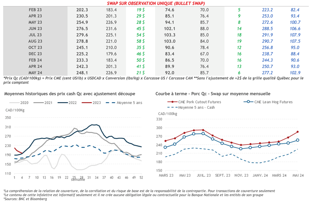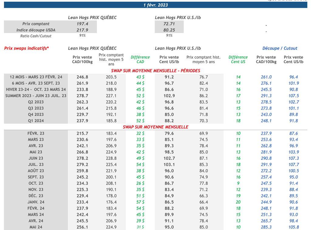 • Bien que l'indice du porc au comptant CME semblait avoir atteint un plancher, il a du mal à gagner un élan vers le haut. En effet, celui-ci est demeuré presque inchangé hier à 72,71 US cents/lb, soit une hausse très modeste de 0,07 US cent/lb. L'histoire est similaire pour la découpe de porc américaine qui a baissé de 0,03 cent US/lb hier pour s'établir à 80,25 cents US/lb.