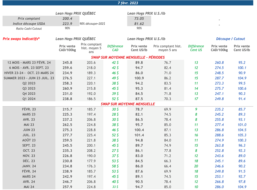 • Tous les contrats sur les porcs, à l'exception de l'échéance de février-23, ont terminé la journée en territoire négatif hier. Notamment, le contrat actif avril-23 a terminé la journée à 82,68 cents US/lb pour une perte quotidienne de 3,80 cents US/lb, sa plus grande perte quotidienne en 2023 à ce jour.