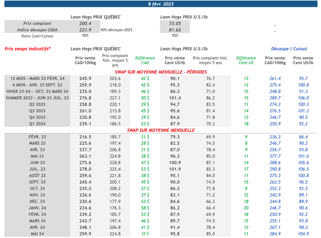 • Le creux apparent du marché au comptant pourrait expliquer la force relative des échéances rapprochées. En effet, l'indice du porc au comptant CME a affiché un gain de 0,24 cents US/lb hier, un 7e gain au cours des 9 derniers jours ouvrables depuis le creux du 25 janvier. Du côté du commerce de gros, l'indice de la découpe de porc américain a perdu 3,06 cents US/lb hier, pour s'établir à 78,56 cents US/lb.