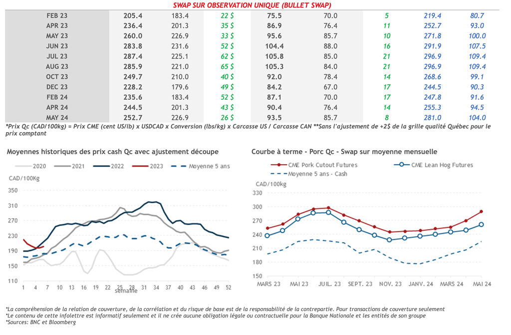 • Le marché du porc était en forte hausse hier, mené par le contrat actif d’avril-23 qui a gagné 3,03 cents US/lb sur la journée, notamment dû à des fermetures de positions courtes.