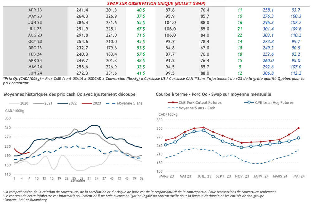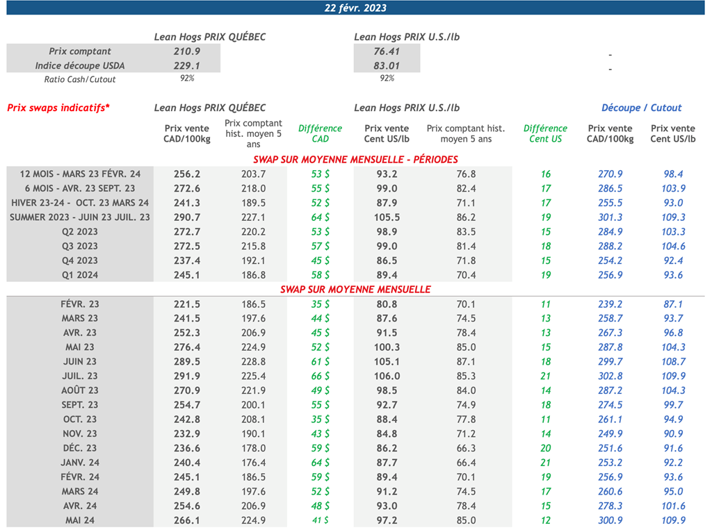 • L’indice du porc au comptant du CME a continué son ascension hier aussi pour enregistrer son 12e gain consécutif pour s’établir à 76,41 cents US/lb. Pour l’indice de la découpe américaine, on observait une forte baisse soit 4,71 cents US/lb et a terminé à 83,01 cents US/lb. Cette baisse quotidienne est la plus importante depuis le début de l’année.