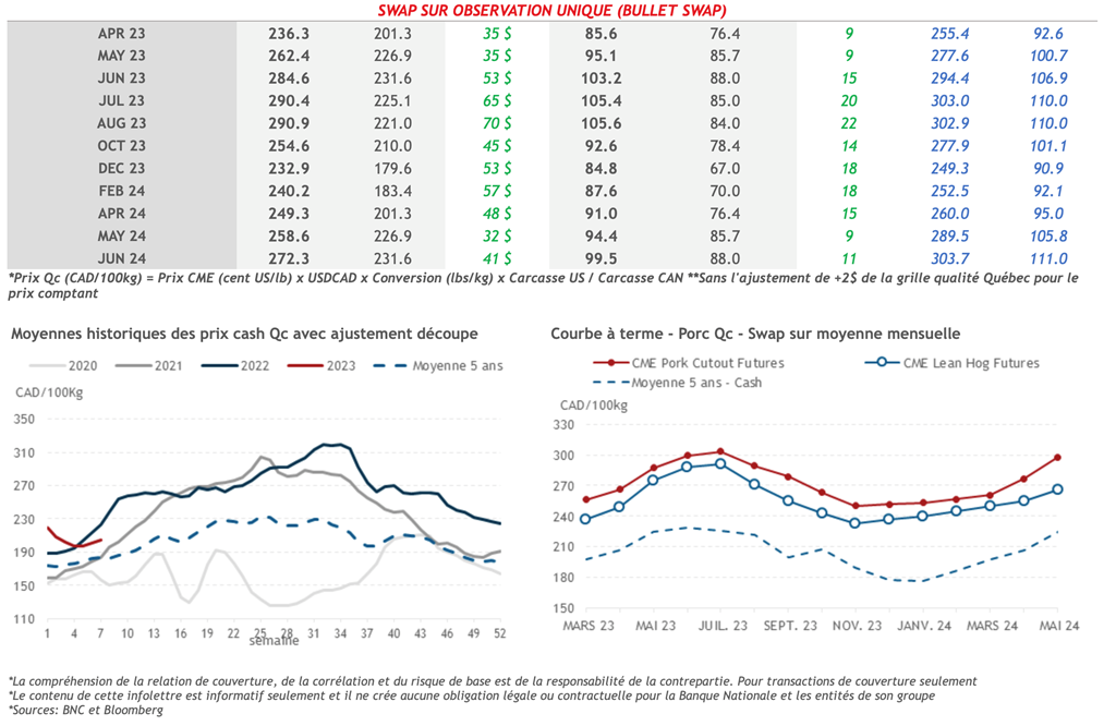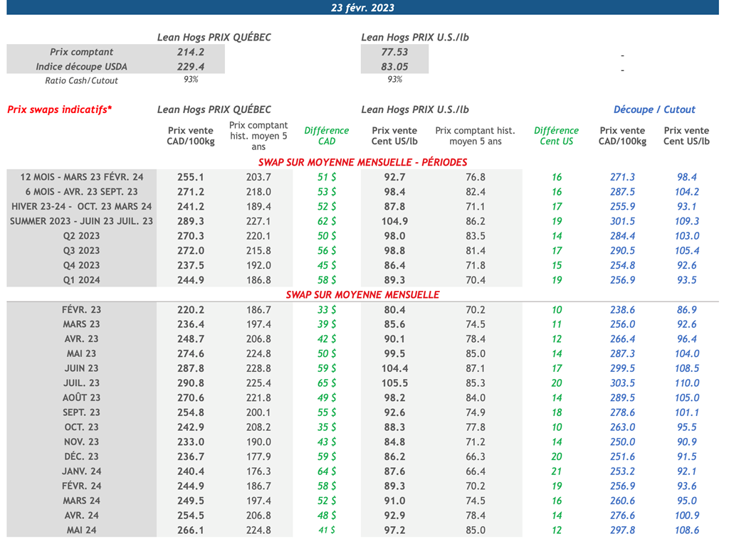 • Hier les contrats de porc ont baissé pour les maturités allant jusqu’à octobre-23. Le contrat d’avril-23 a perdu le plus soit 2,55 cents US/lb pour terminer la journée à 86,55 cents US/lb.