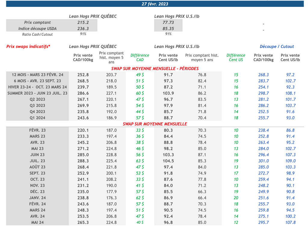 • L’indice du porc au comptant du CME affichait un gain hebdomadaire pour une quatrième semaine consécutive. En effet, l’indice a gagné 2,11 cents US/lb la semaine dernière pour s’établir à 77,73 cents US/lb vendredi. L’indice de la découpe de porc américain était aussi en hausse avec un gain de 3,26 cents US/lb sur la semaine pour s'établir à 85,35 cents US/lb vendredi.