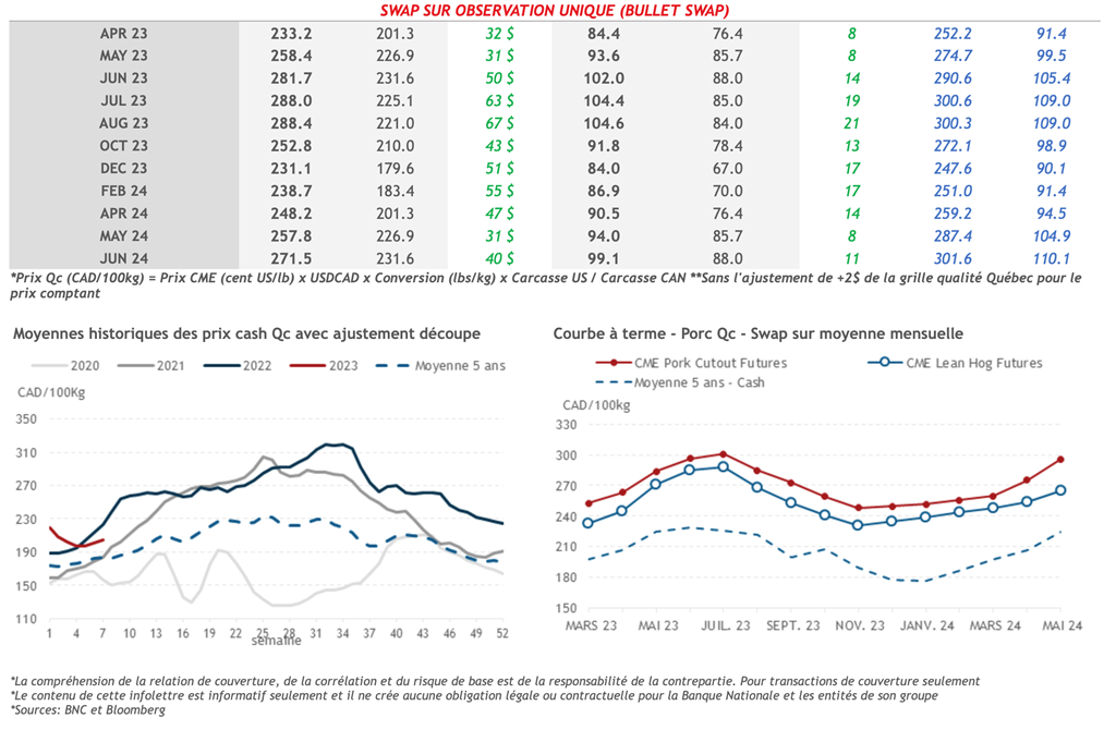 • Les contrats de porc ont terminé la semaine à la hausse pour les maturités allant jusqu’en décembre-2023. Le gain le plus important fut enregistré par le contrat d’août-23 qui a gagné 1,43 cents US/lb sur la semaine pour terminer la semaine à 106,00 cents US/lb. Mardi, après l’annonce de la Chine indiquant qu’ils allaient accumuler 20k tonnes de porc congelé pour ravitailler leur réserve stratégique, les contrats à terme ont bondit, mais ont retombé le lendemain.