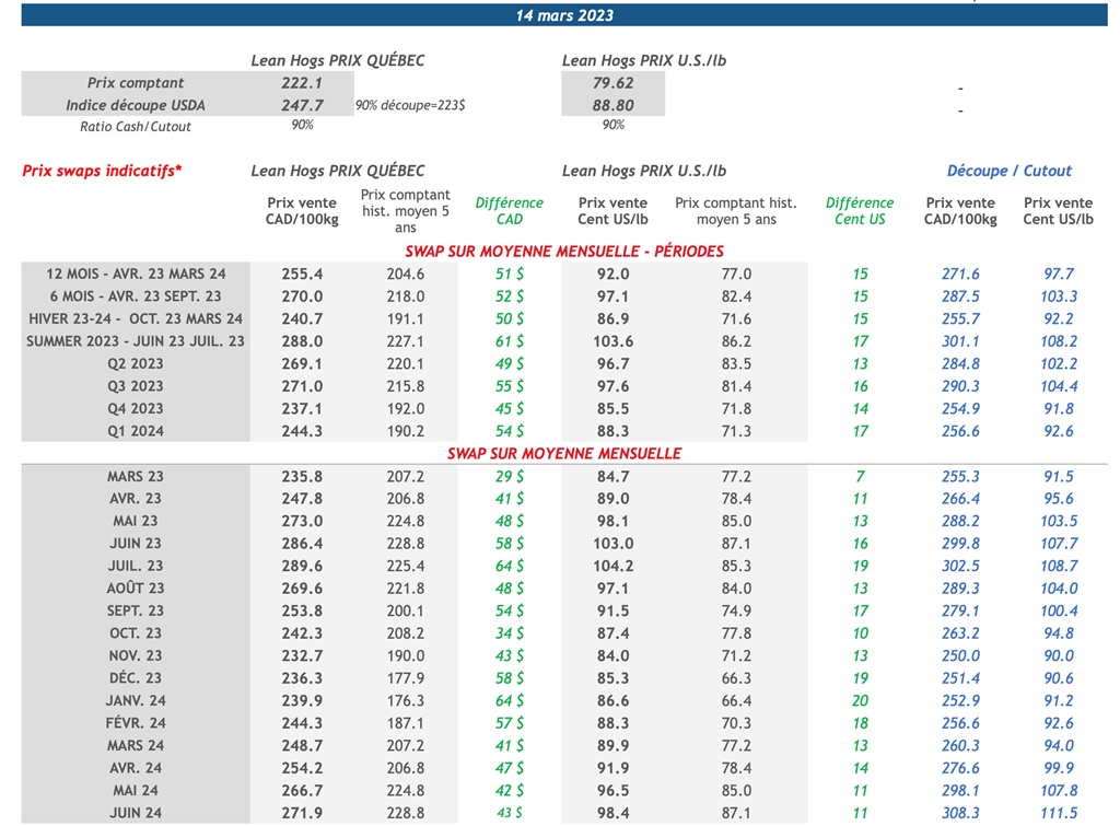 • Les contrats à terme sur le porc ont terminé en ordre dispersé hier, les contrats les plus actifs à échéances les plus rapprochées terminant en baisse alors que les échéances plus éloignées gagnaient un peu de terrain. Le contrat actif d’avril-23 était le plus en baisse, perdant 1,23 cents US/lb sur la journée pour clôturer à 86,23 cents US/lb.