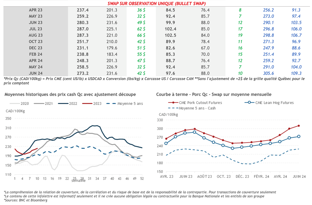• Durant la journée d'hier, les contrats à terme sur le porc étaient en baisse, menés par le contrat d'août-23 qui a perdu 1,13 cents US/lb durant la journée et qui s'est installé à 104,03 cents US/lb.
