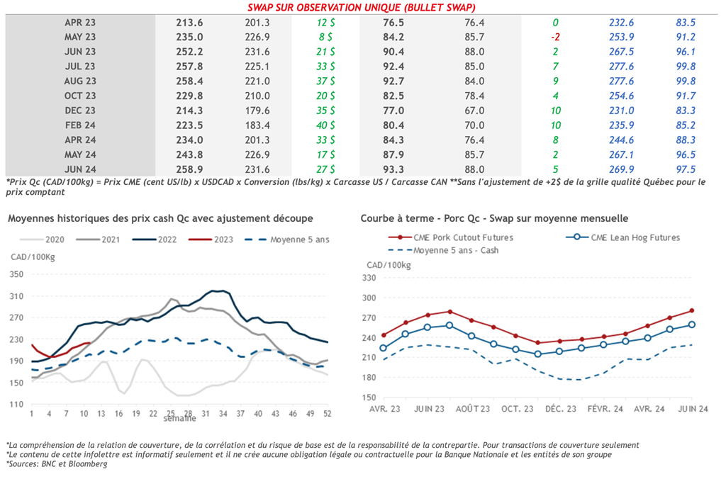 • Hier, les contrats sur le porc ont terminé en territoire négatif, alors qu'ils affichaient une baisse pour la 8ème fois en 10 sessions. Les contrats d'été ont été les plus touchés, en particulier celui d'août-23, qui a comptabilisé une baisse quotidienne de 1,00 cent US/lb.