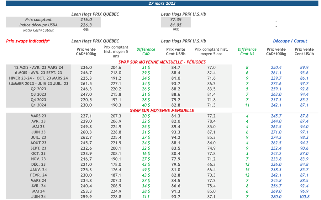 • La semaine dernière, toutes les échéances des contrats sur le porc ont terminé en baisse. C’est le contrat d'avril-23 qui a subi la plus forte baisse en diminuant de 2,70 cents US/lb sur la semaine.