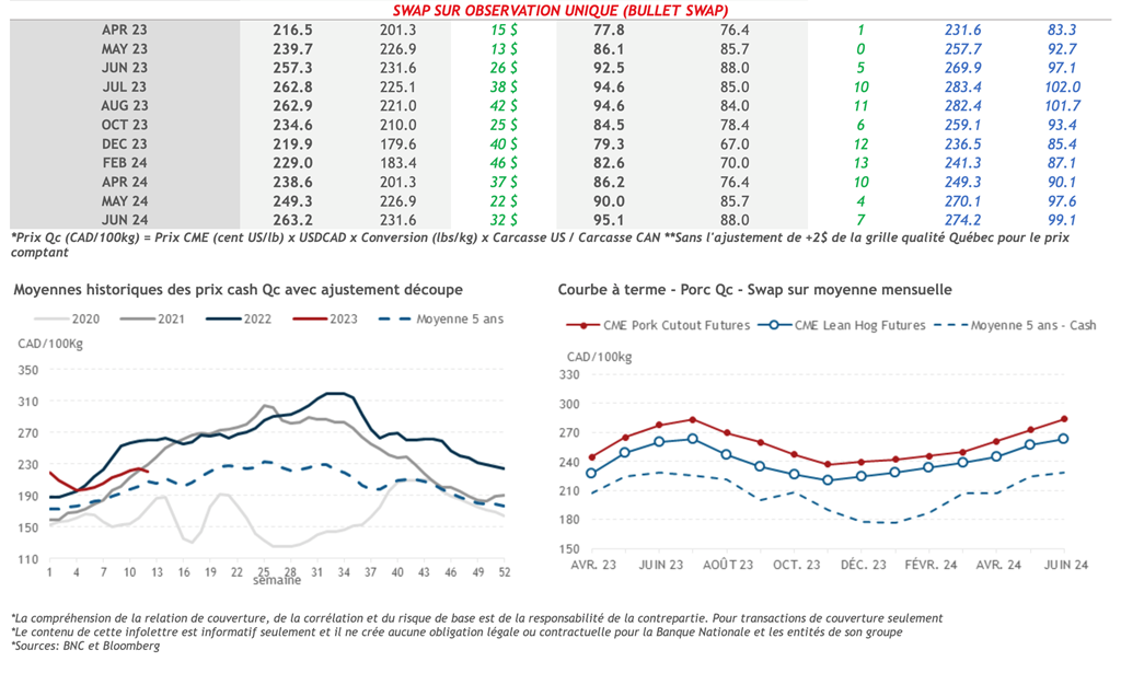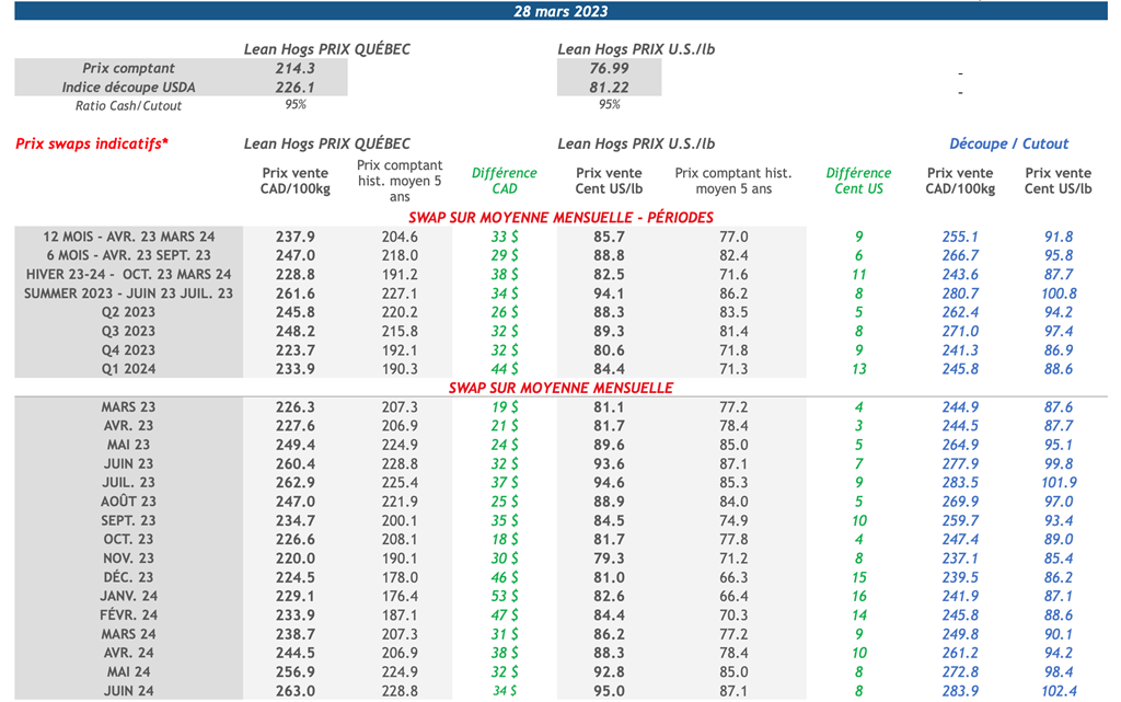 • Hier, les contrats de porc ont terminé en hausse pour toutes les échéances, avec le contrat d'avril-23 enregistrant un gain de 1,28 cents US/lb, poursuivant ainsi son ascension depuis vendredi dernier.