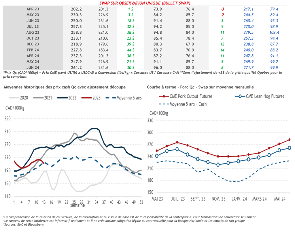• Hier, les contrats à terme sur le porc ont terminé de manière dispersée, enregistrant de légères pertes pour les échéances rapprochées et des gains pour les échéances à partir de juillet-23. Notamment, le contrat d'avril-23 a terminé en baisse pour une 5e journée consécutive, clôturant à 74,53 cents US/lb.
