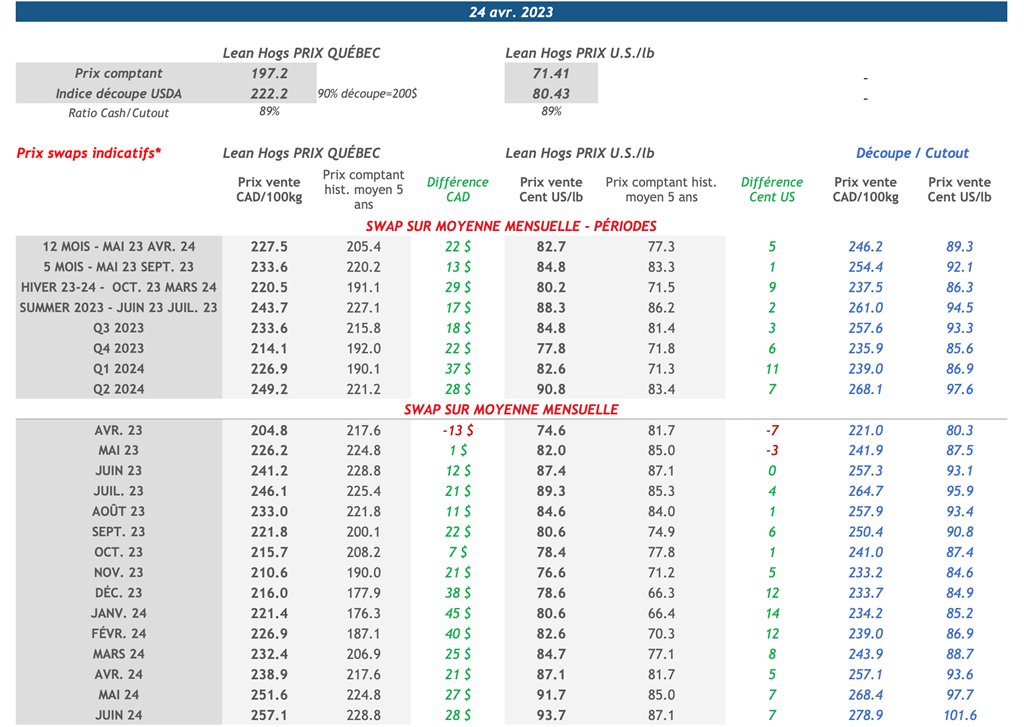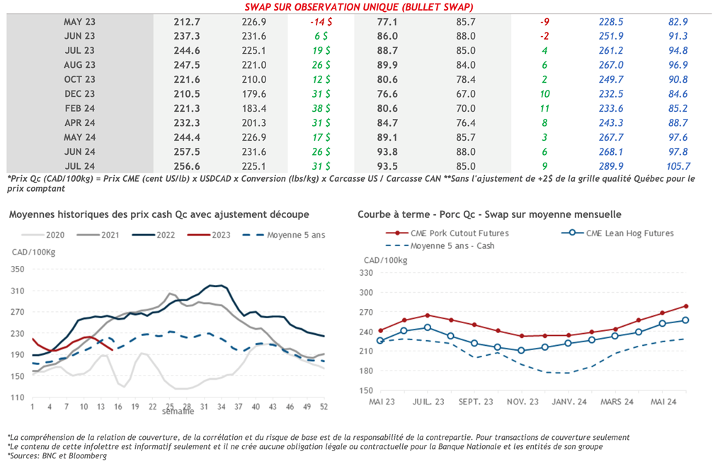 • La semaine dernière, les contrats à termes de porc ont connu peu de mouvement, à l'exception du contrat de mai-23 qui a chuté de 3,43 cents US/lb pour clôturer à 77,03 cents US/lb vendredi. Les variations sur le reste de la courbe ont été assez limitées avec des pertes pour les échéances rapprochées et des gains modérés pour les maturités plus lointaines.