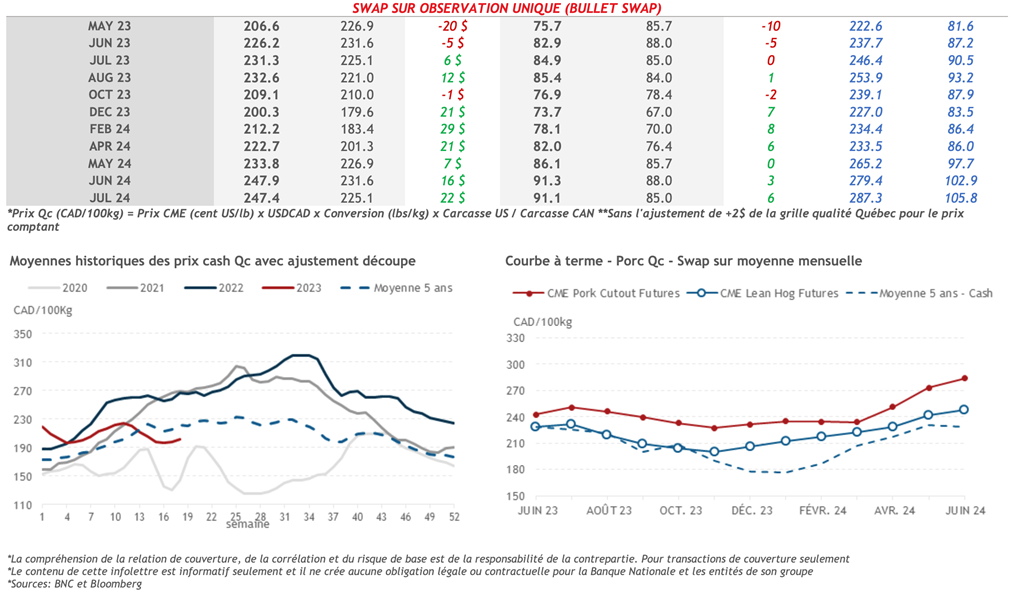 • Hier, les contrats à terme sur le porc ont terminé la journée en territoire négatif. Notamment, le contrat actif de juin-23 a baissé de 0,48 cent US/lb sur la journée pour atteindre le prix de 83,30 cents US/lb.