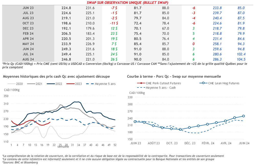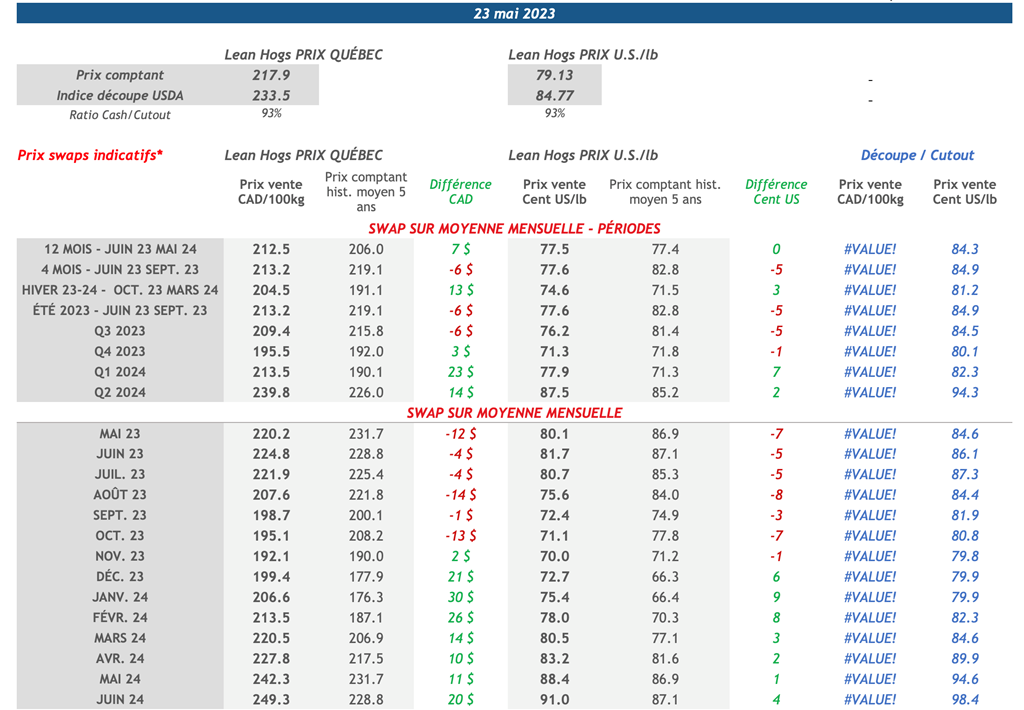 • Hier, les contrats à terme sur le porc ont clôturé à la baisse sur l'ensemble de la courbe. Le contrat de juin-23 a notamment enregistré une baisse de 1,20 cents US/lb pour clôturer à 81,83 cents US/lb.