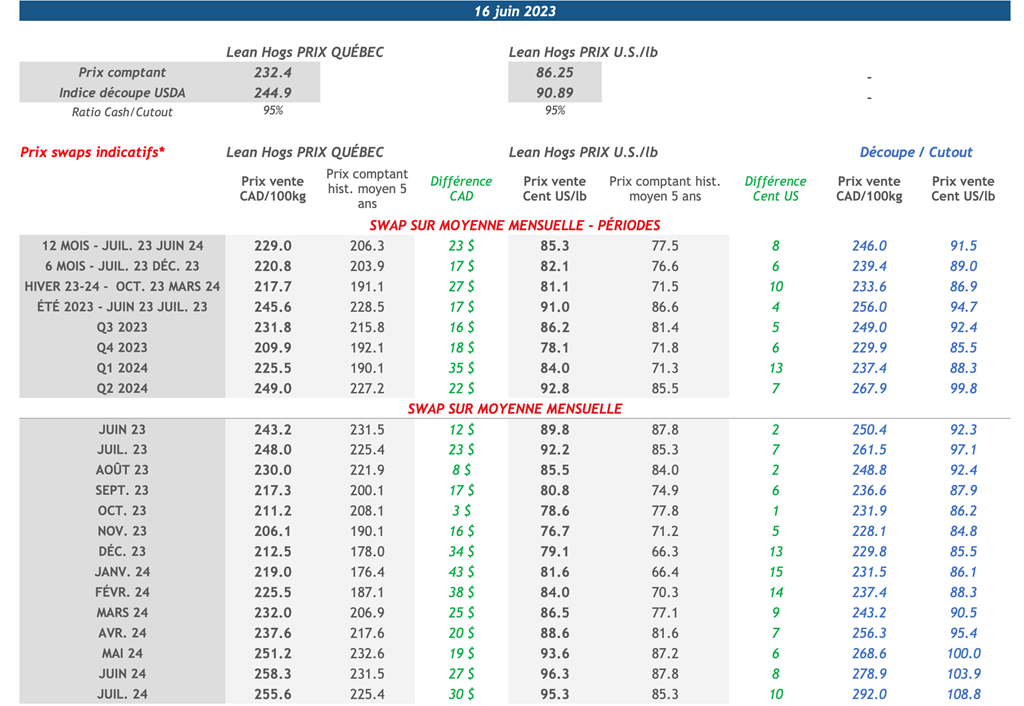 • Les contrats à terme sur le porc ont terminé la journée d'hier de manière mixte. L'échéance de juillet-23 a enregistré une baisse de 0,85 cent US/lb, tandis que le contrat d'août-23 a affiché un gain de 0,63 cent US/lb.