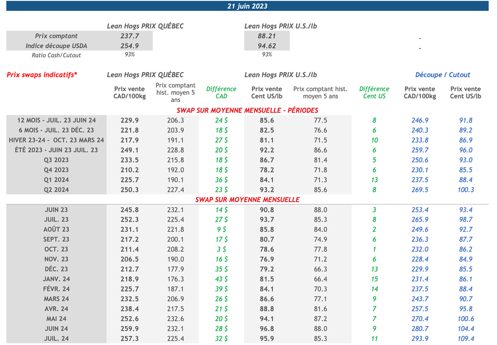 • Hier, dès l'ouverture des marchés, les contrats à terme sur le porc ont bondi et ont maintenu ce niveau pour terminer en territoire positif sur l'ensemble de la courbe. Notamment, le contrat de juillet-23 a affiché son gain le plus important depuis deux semaines, soit 3 cents US/lb, et a clôturé à 95,85 cents US/lb.
