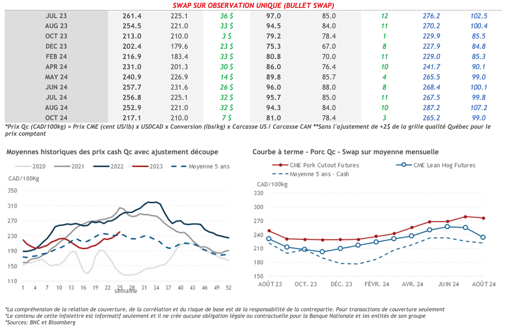 • La semaine dernière, les contrats à terme sur le porc ont terminé en affichant des hausses pour les deux premières échéances et des pertes pour les autres maturités. Notamment, le contrat à terme de juillet-23 a terminé la semaine avec un gain de 4,38 cents US/lb, clôturant à 95,65 cents US/lb vendredi dernier.