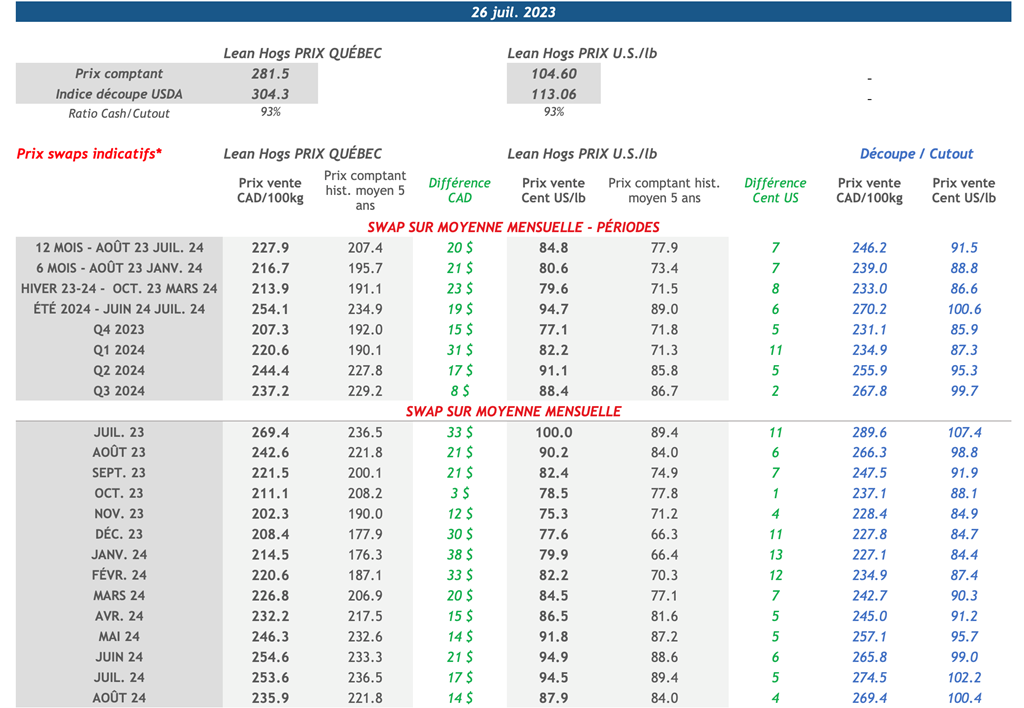 • Hier, les contrats à terme sur le porc ont terminé en hausse sur l’ensemble de la courbe, menés par le contrat d’octobre-23 qui a enregistré un gain de 1,75 cents US/lb sur la journée pour clôturer à 84,38 cents US/lb.