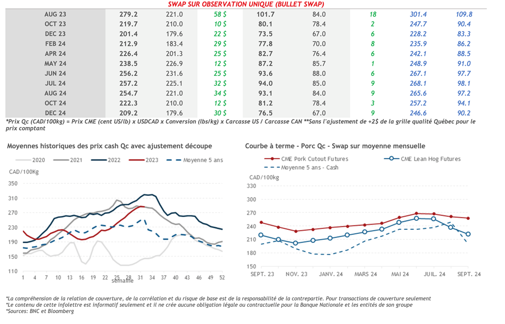 • La semaine dernière, les contrats à terme sur le porc ont enregistré une baisse sur l'ensemble de la courbe, à l'exception du contrat d'août-23, qui a légèrement progressé. À l’opposé, le contrat actif d’octobre-23 a perdu 1,75 cent US/lb sur la semaine pour clôturer à 81,33 cents US/lb.