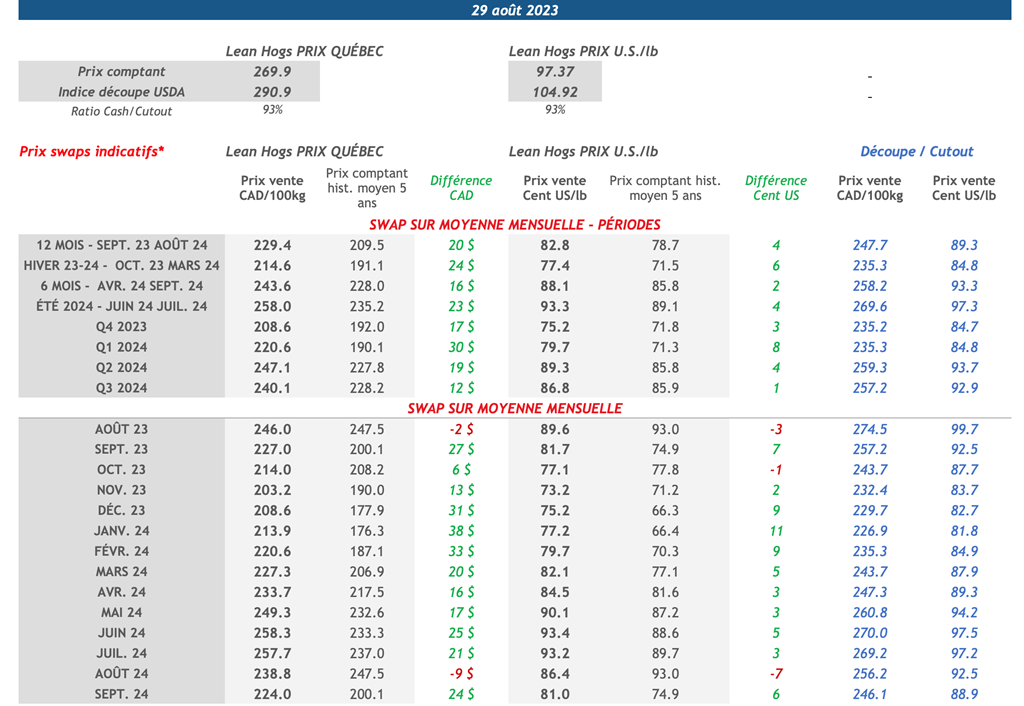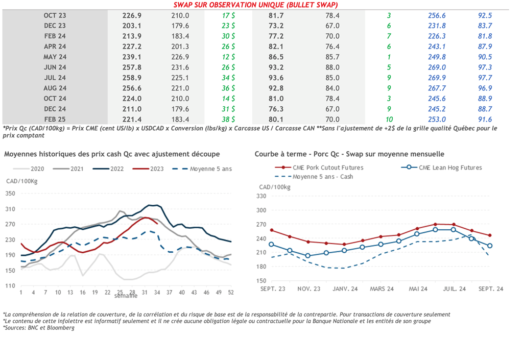 • Après un début de journée difficile, les contrats à terme sur le porc se sont redressés vers 10 h et n'ont jamais regardé en arrière pour terminer dans des territoires positifs pour toutes les échéances. Comme c'est souvent le cas, les échéances rapprochées, plus activement transigées, ont mené la charge. Notamment, les échéances d’octobre-23 et de décembre-23 gagnaient respectivement 2,4% et 1,9% sur la journée.