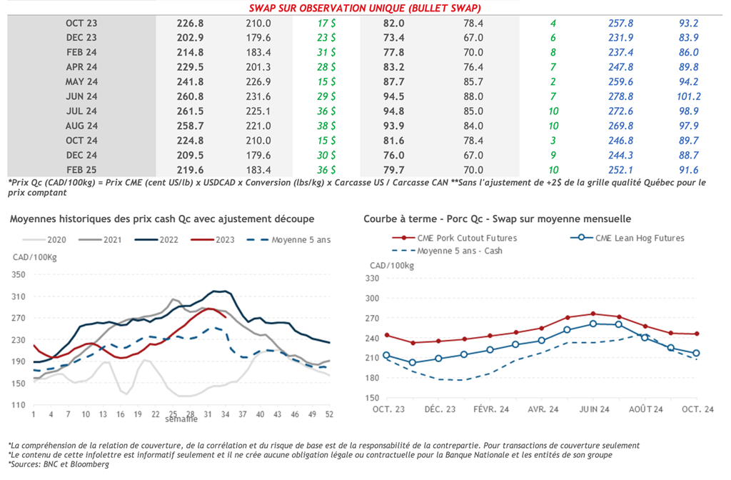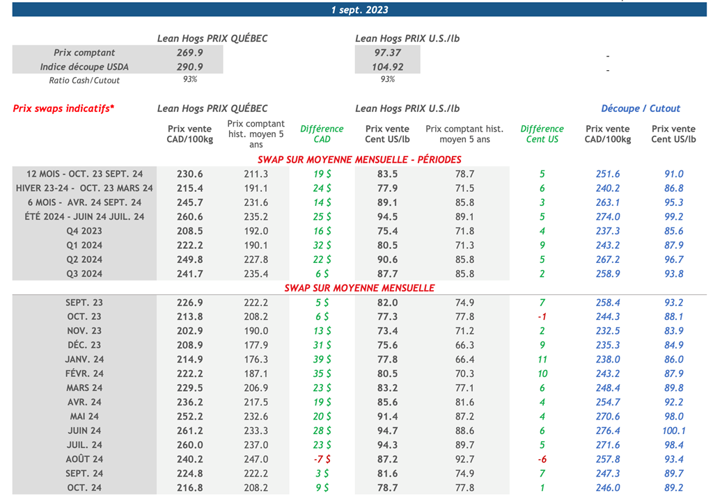 • Les contrats à terme sur le porc ont terminé en demi-teinte hier, les contrats avec échéances pour l'été 2024 terminant en territoire positif pendant que les échéances rapprochées finissaient dans le rouge. Notamment, le contrat actif d’octobre-23 a perdu 1,05 cents US/lb au cours de la journée, clôturant à 82,55 cents US/lb.